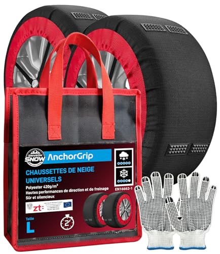 Chaussettes de Neige Textile Homologuées EN 16662-1 Taille L Chaussette Pneu Voiture - DriveonSnow AnchorGrip avec Crampons Antidérapage Montage Rapide 2 Minutes Haute Sécurité + Gants
