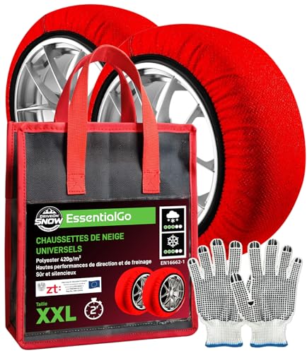 Chaussettes de Neige Textile Homologuées EN 16662-1 Taille XXL Chaussette Pneu Voiture - DriveonSnow EssentialGo Montage Rapide 2 Minutes Haute Sécurité pour Chutes de Neige Occasionnelles + Gants