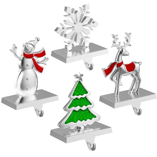 Ginbel Direct Lot de 4 supports de chaussettes de Noël lestés pour cheminée - Flocon de neige, bonhomme de neige, arbre, cerf, renne - Crochets lourds pour cheminée, fenêtres, décorations d'intérieur