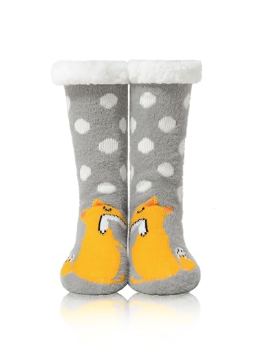 WOTENCE Chaussettes Antidérapantes Femme Chaud Fuzzy Doublé Mignon Animal Hiver Maison Pantoufle Chaussettes Cadeau De Noël(Renard Gris)