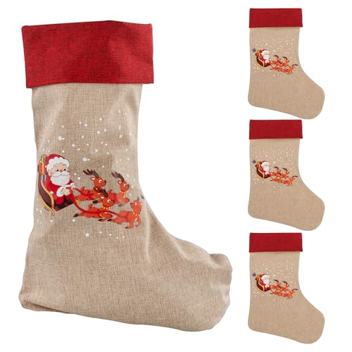 Idena 90477 - Chaussettes de Noël env. 31 x 46 cm, 4 pièces, Chaussettes en Tissu Rouge et Brun avec Le Motif du Père Noël dans Une Luge de Rennes et l'inscription Joyeux Noël