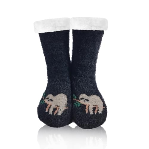 WOTENCE Chaussettes Antidérapantes Femme Chaud Fuzzy Doublé Mignon Animal Hiver Maison Pantoufle Chaussettes Cadeau De Noël(Paresseux Noir)