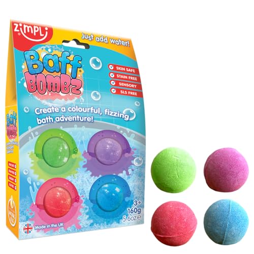 ZIMPLI Lot de 4 Baff Bombz, Crée une aventure colorée et pétillante à l’heure du bain, Coffret cadeau de bombes de bain pour enfants, Petits cadeaux pour chaussettes de Noël, Bio et naturel