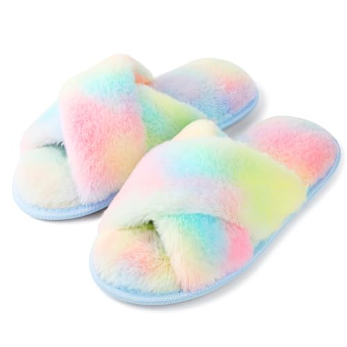 riemot Chaussons Femme Pantoufles en Mousse à Mémoire de Forme Antidérapantes et Confortables Chaussons Femme Hiver Pelucheuses Pelucheuses Bout Ouvert Slipper Pour Intérieur/extérieur,Rainbow,EU38-39