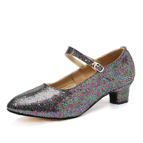 SWDZM Chaussure Danse Latine Femme Bout Fermé Lanière en T Valse Chaussure de Danse De Salon Tango Salsa,Argent,Talon 3.5cm,Semelle en Caoutchouc,37.5EU
