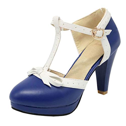 LOVOUO Femme Chaussure Mary Jane Escarpin Rockabilly Vintage Rétro Talon Bloc Lanière Carré Haut Plateforme Chunky avec Noeud Boucle 9CM(Bleu Marine,39)