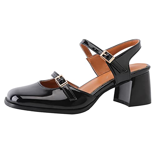 OALEEN Chaussure Mary Jane Femme Vernis Vintage Petit Talon Carré Bride Cheville Escarpin Ouverte Arrière Soirée Mariage Noir 38