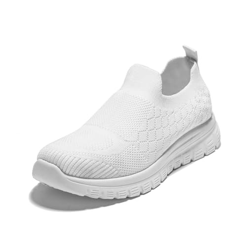 JOMIX Chaussure sans Lacets Femmes Chaussures de Marche Femmes Chaussures Slip on Sneakers Chaussure en Maille Respirantes Légères Confortables (Blanc, 39)