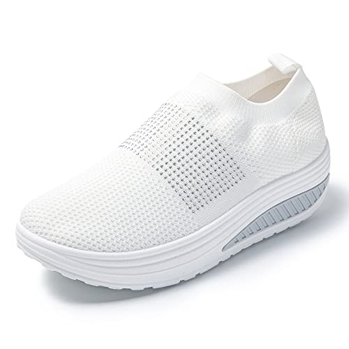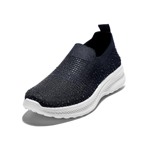 JOMIX Chaussure sans Lacets Femmes Baskets Femme Chaussures de Marche Femmes avec Strass Slip on Sneakers Respirantes Légères (Blanc, 41)