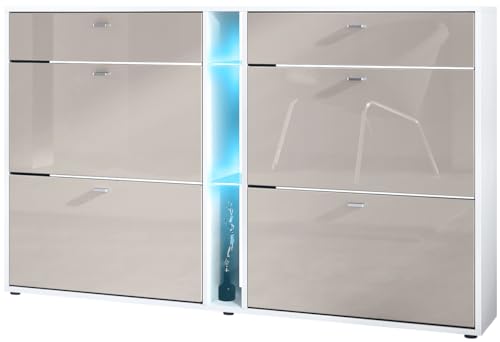 Vladon Meuble à Chaussures à Bascule Today 155,5 x 95 x 28 cm, avec Un éclairage LED RGB, Corps en Blanc Mat, façades en Gris Sable Haute Brillance
