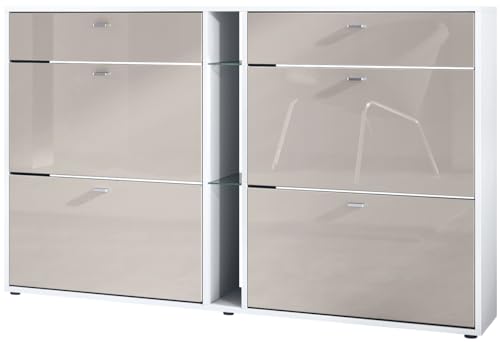 Vladon Meuble à Chaussures à Bascule Today 155,5 x 95 x 28 cm, Corps en Blanc Mat, façades en Gris Sable Haute Brillance