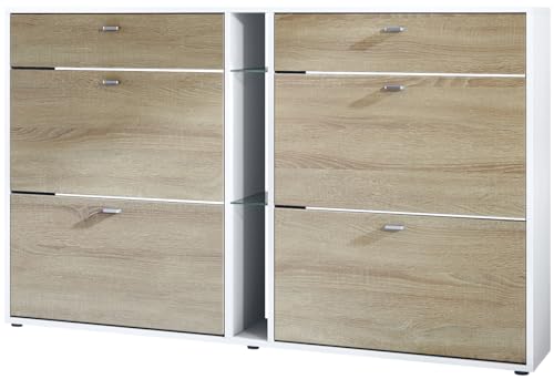 Vladon Meuble à Chaussures à Bascule Today 155,5 x 95 x 28 cm, Corps en Blanc Mat, façades en chêne Brut