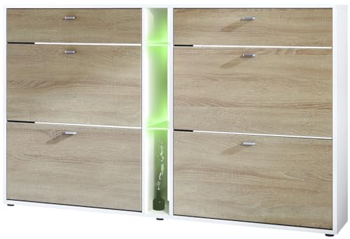 Vladon Meuble à Chaussures à Bascule Today 155,5 x 95 x 28 cm, avec Un éclairage LED RGB, Corps en Blanc Mat, façades en chêne Brut