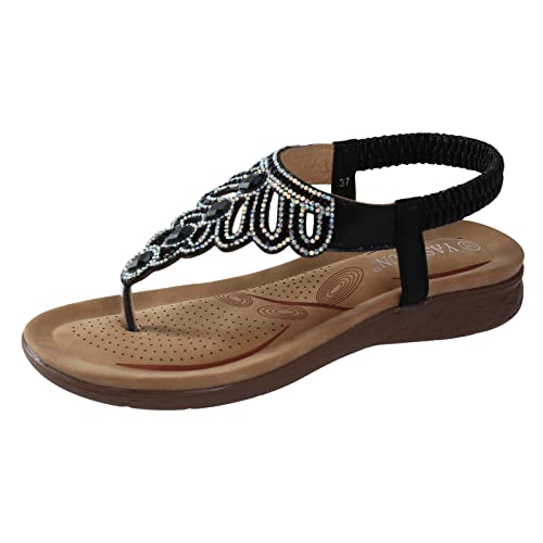Chaussures Femme Ete Sandales Plateforme Femme Sandales Pour Femmes Confort Avec Bride à La Cheville Élastique Décontracté Bohème Chaussures de Plage Strass Sandals Noires (Black 42)