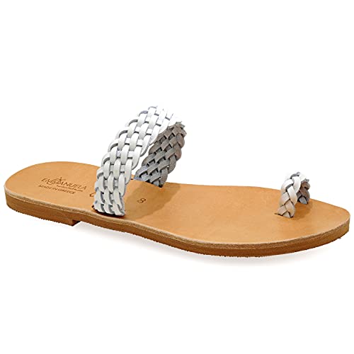 39 blanc Emmanuela Sandales dans le style grec ancien en cuir plat à la main avec bague à orteils, chaussures d'été avec des coupes de passage pour femmes