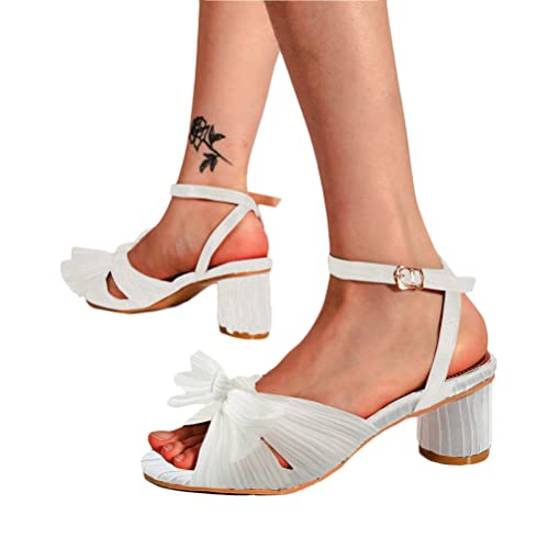 ORANDESIGNE Femmes Plissé Nœud de Nœud Sandales à Talon Bout Ouvert Courroie de Cheville Bloc à Talon épais Diapositives Bridal Chaussures pour Robe de Mariée C Blanc 43 EU