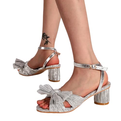 ORANDESIGNE Femmes Plissé Nœud de Nœud Sandales à Talon Bout Ouvert Courroie de Cheville Bloc à Talon épais Diapositives Bridal Chaussures pour Robe de Mariée C Argent 37 EU