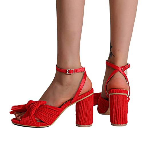 ORANDESIGNE Femmes Plissé Nœud de Nœud Sandales à Talon Bout Ouvert Courroie de Cheville Bloc à Talon épais Diapositives Bridal Chaussures pour Robe de Mariée A Rouge 37 EU