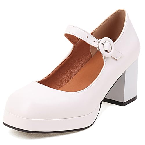 Lroey Reoly Chaussures Mary Jane à Talon Carré pour Femme, Pompe à Talon Élevé Bout Carré Boucle Robe Pumps avec Plateforme Facile Yiwuuo Blanc Taille 43 EU