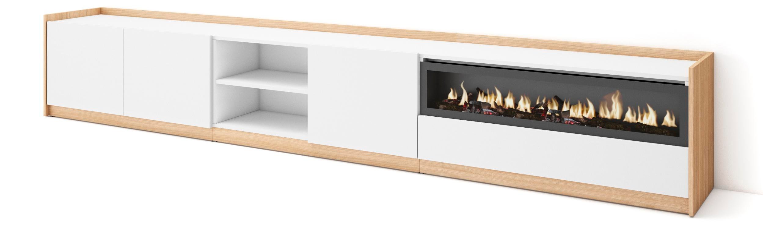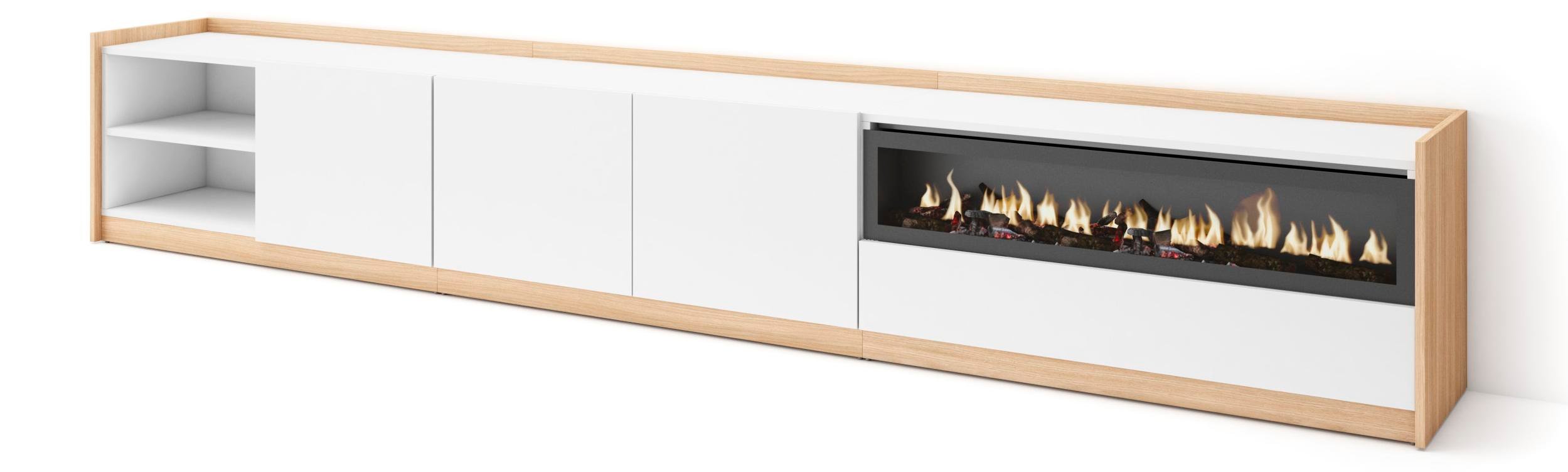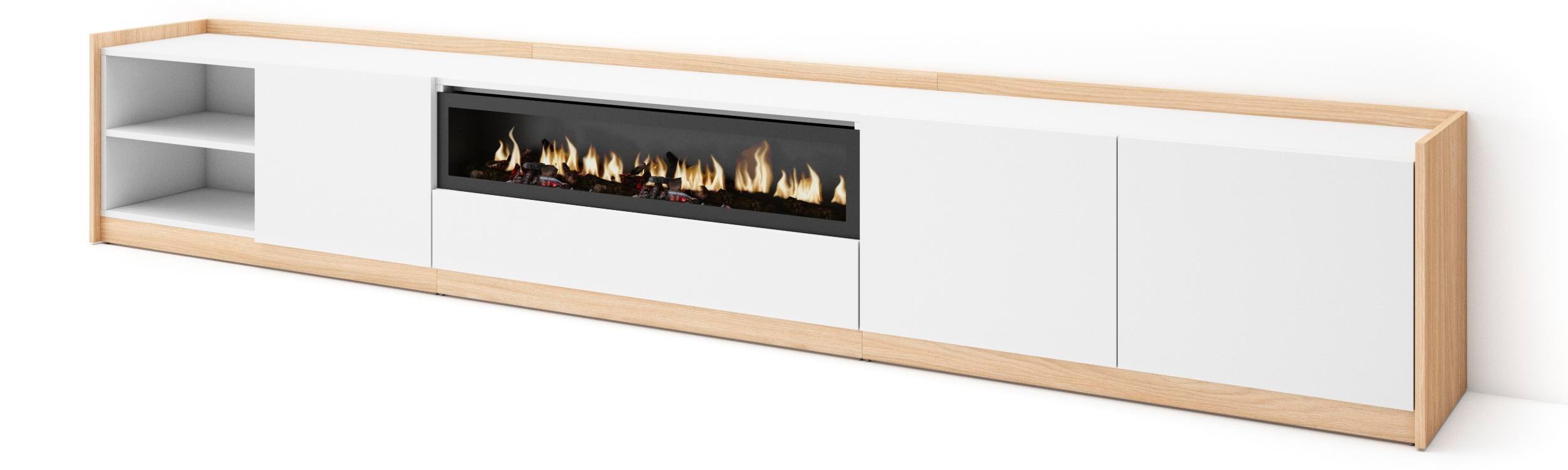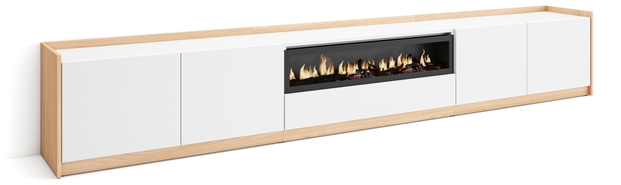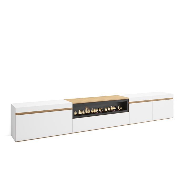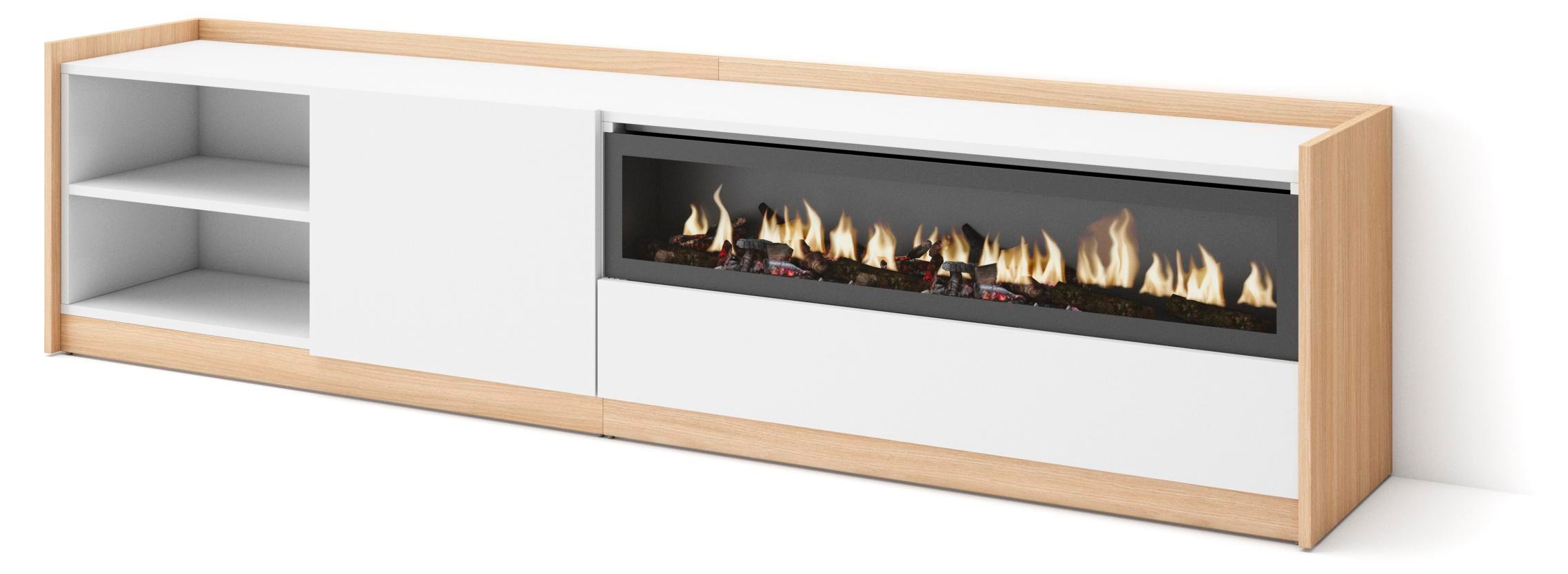 Meuble TV Banc Télé 200x35x45cm Pour les TV jusquà 80 Cheminée électrique Blanc et Chêne Soft RF3774