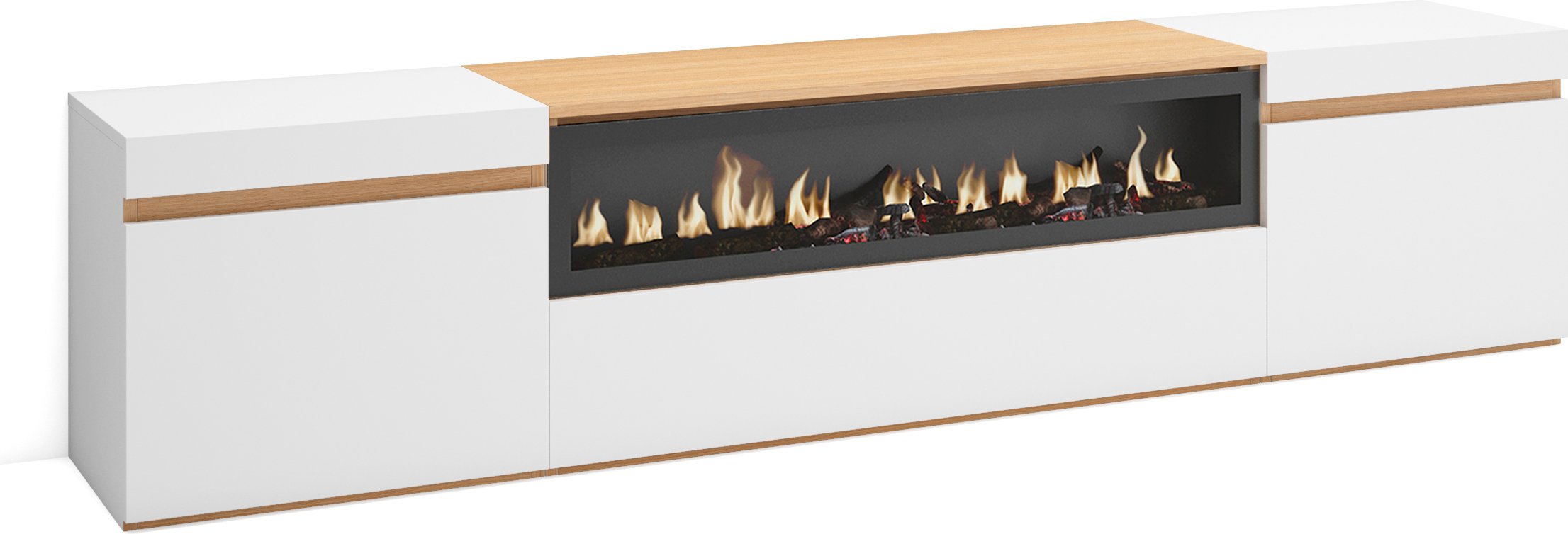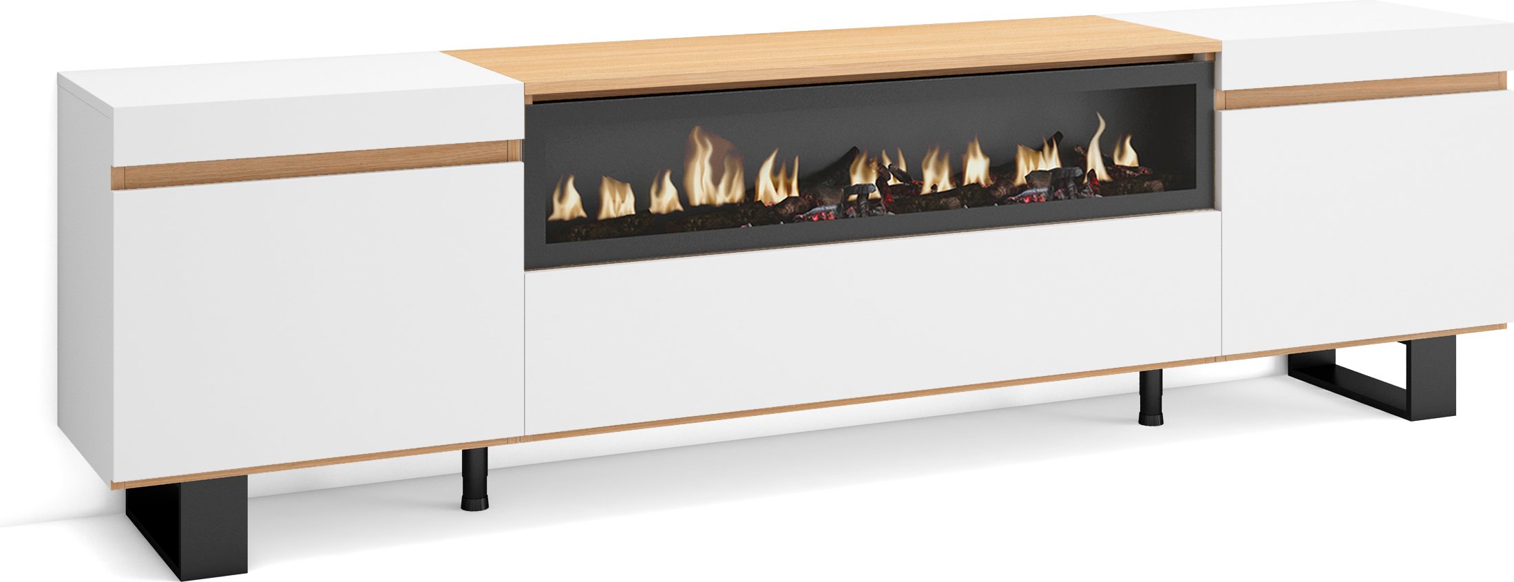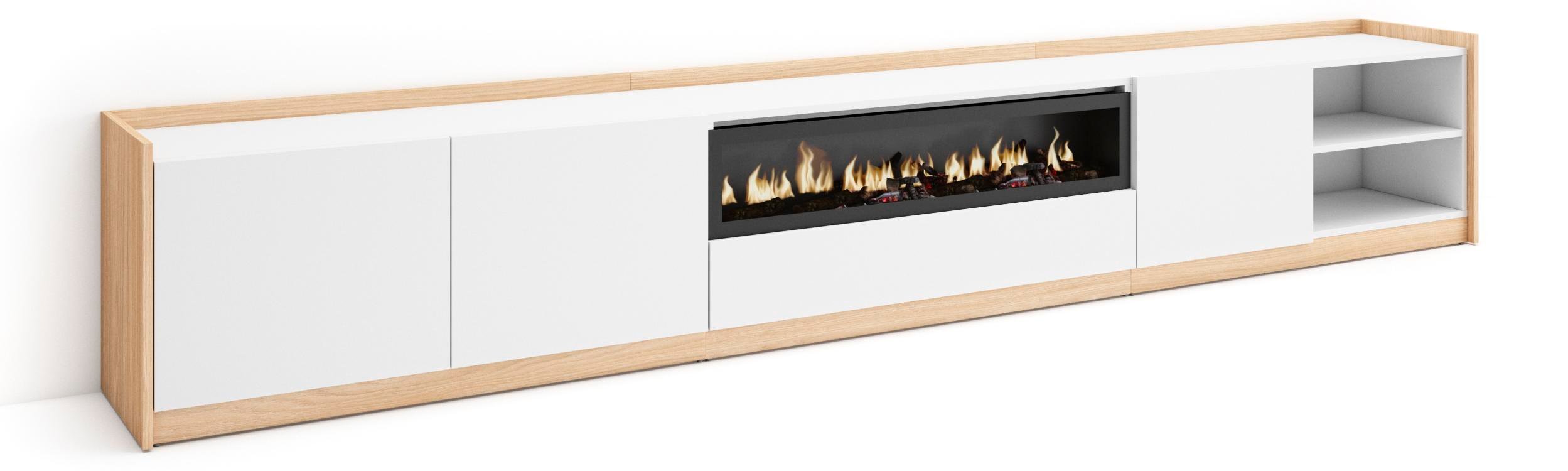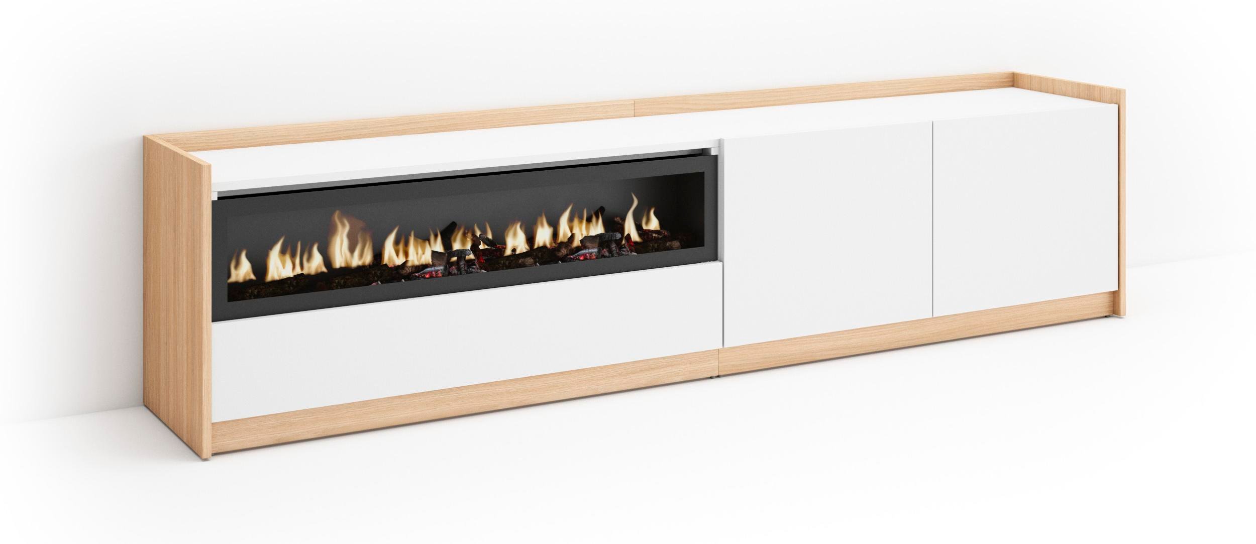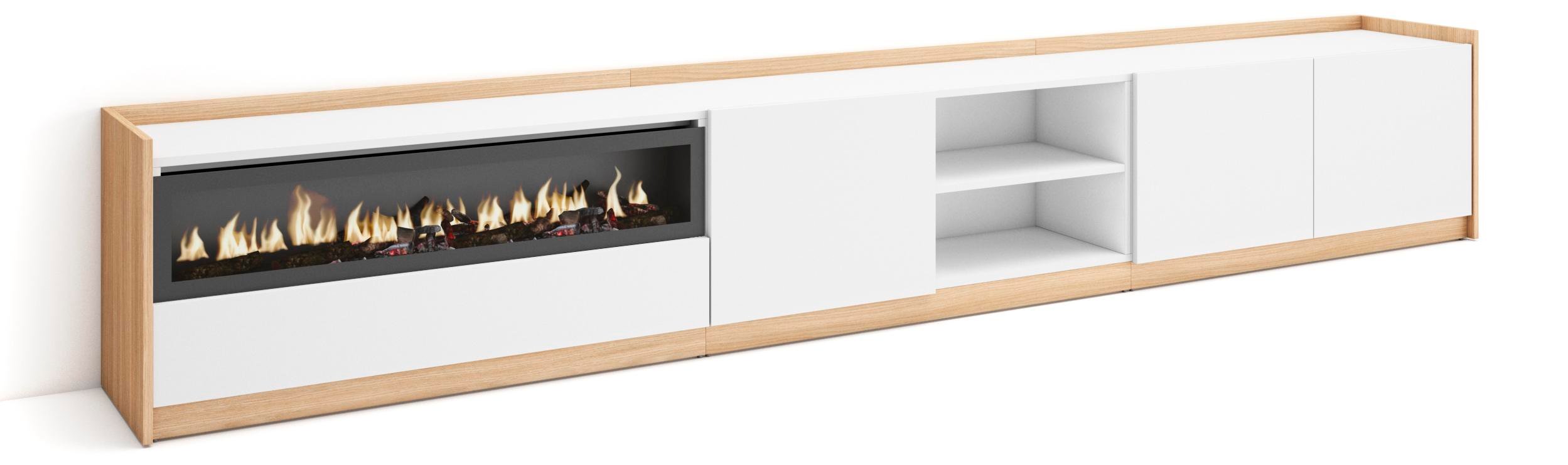 Meuble TV Banc Télé 200x35x45cm Pour les TV jusquà 80 Cheminée électrique Blanc et Chêne Soft RF3774