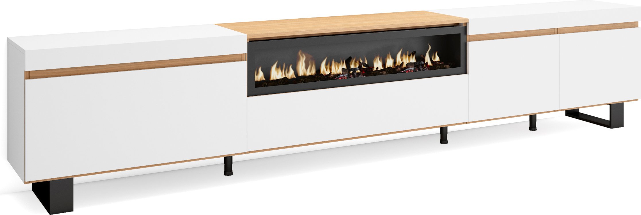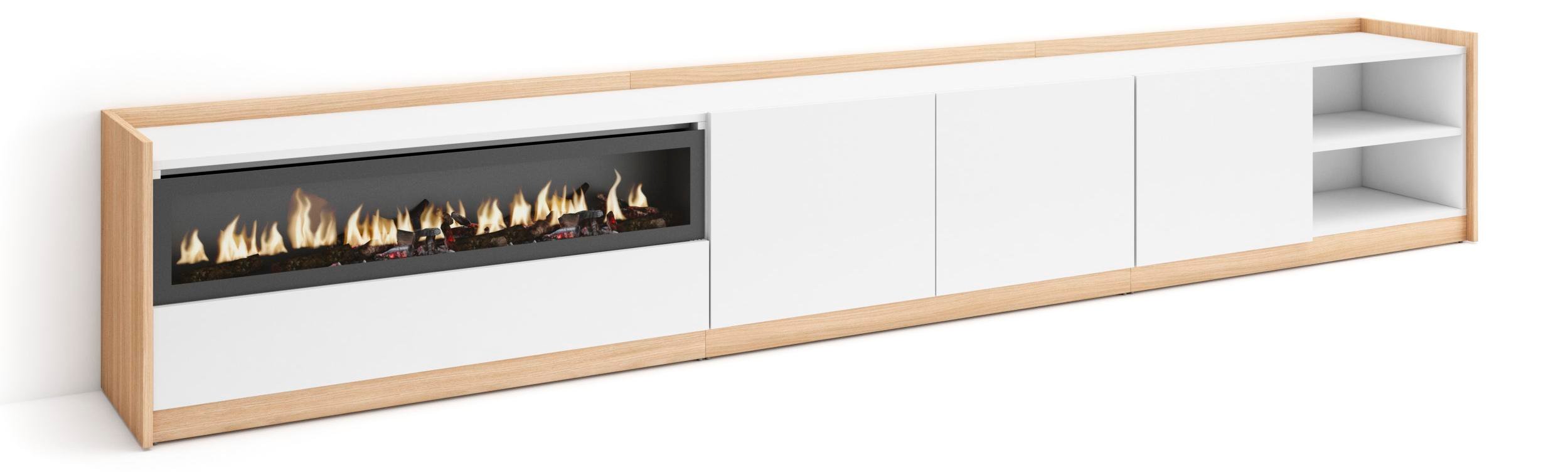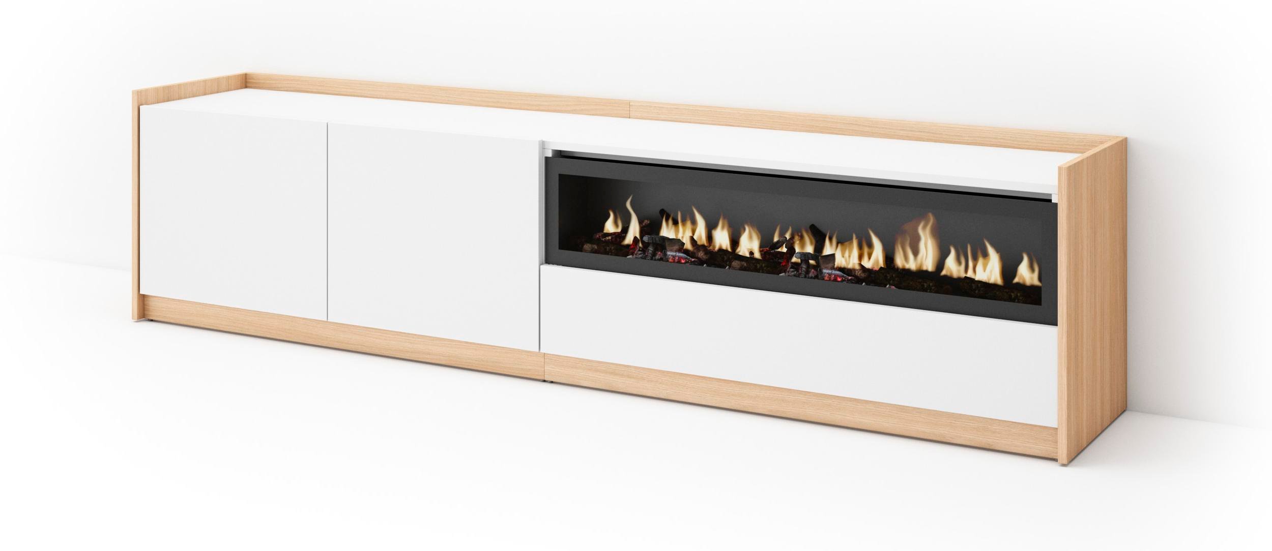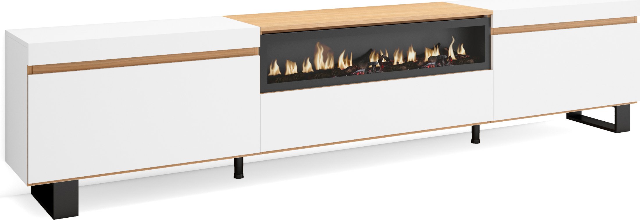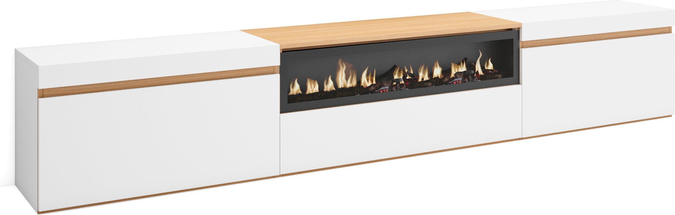 Meuble TV Banc Télé 200x35x45cm Pour les TV jusquà 80 Cheminée électrique Blanc et Chêne Soft RF3774