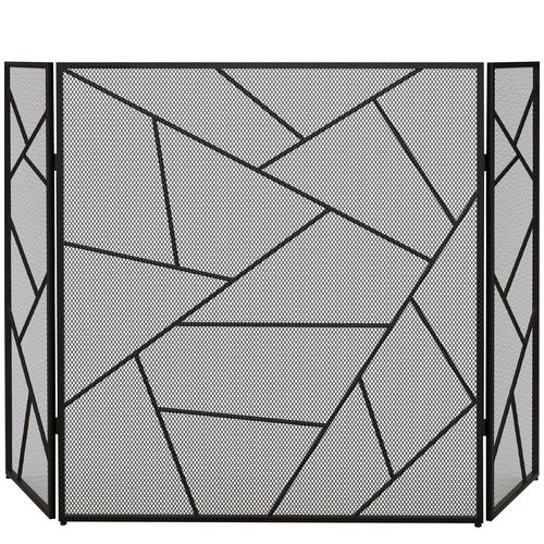 Pare-feu cheminée poêle design graphique - 3 volets pliables - dim. 135L x 1,2l x 85H cm - acier métal noir