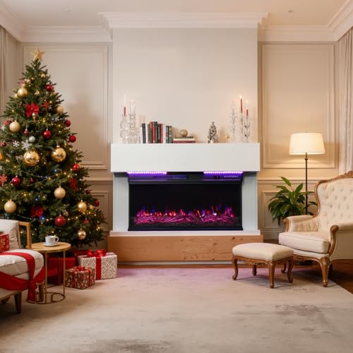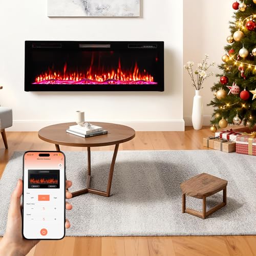 HOMAVO 50" Cheminée Électrique, 1000W/2000W Cheminée Électrique Chauffante, 12 Couleurs de Flamme 3D, 12 Couleurs de Feu en Bois, Pose Murale/Encastrable, Télécommande & APP Contrôle