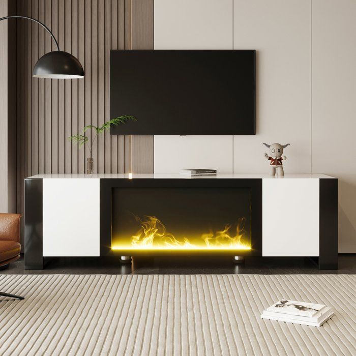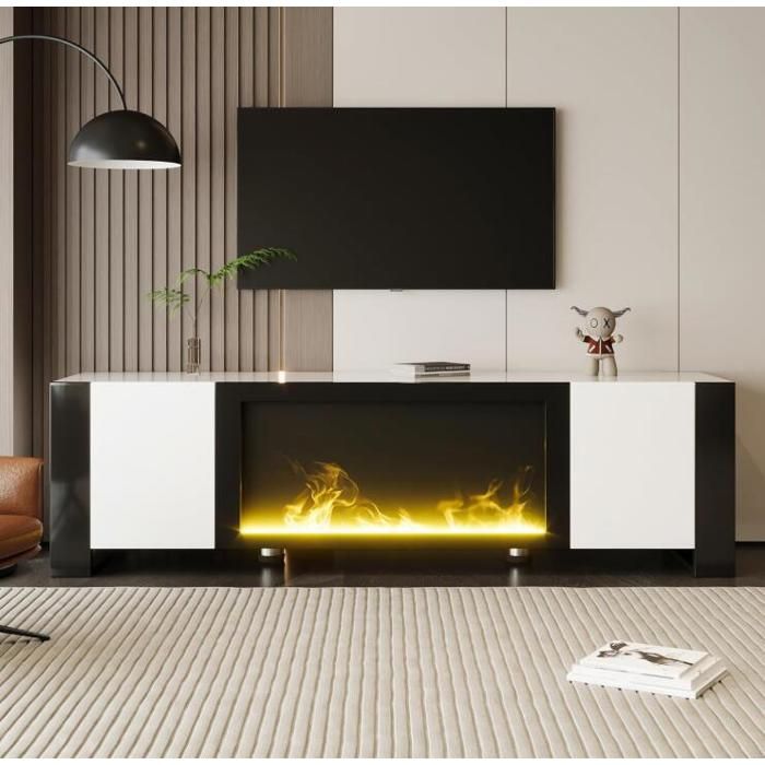 Meuble TV bas Lowboard avec cheminée électrique effet flamme pas de fonction chauffante brillant 165x32x55cm noir + blanc