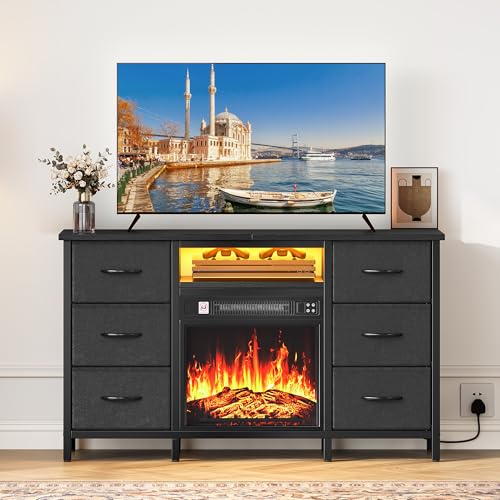 YITAHOME Commode avec Cheminée Electrique, Effet Flamme 3D Réaliste, Commode Chambre avec LED Changeant 6 Tiroirs en Tissu pour Salon, Chambre, Couloir, Cheminee Decorative Autonom (Noir)