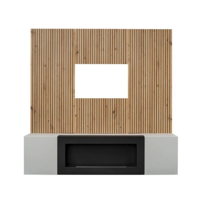 Composition murale fly – chêne clair – meuble tv, vitrines, étagères – cheminée bio-éthanol intégrée