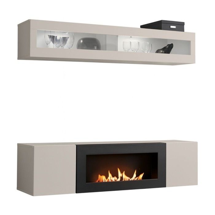 Composition murale fly cachemire avec vitrine partiellement vitrée et meuble tv cheminée bio-éthanol