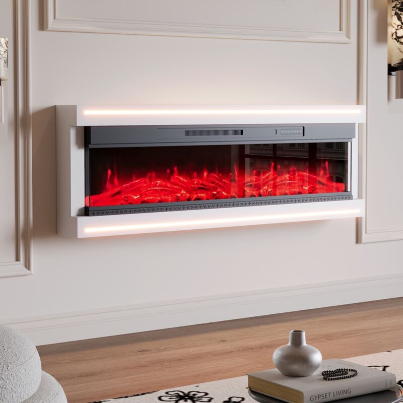 Cheminée électrique murale et encastrable, 12 couleurs de flammes réglables, thermostat réglable, avec ensemble cristal et bois, télécommande et