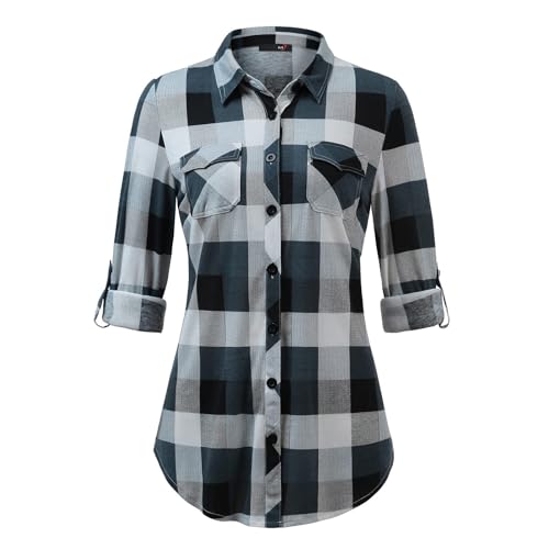 Generisch Chemise à carreaux pour femme - Manches longues - Chemisier en flanelle - Chemise à carreaux - Tunique décontractée - Col en V - Hauts traditionnels - Coton - Chemise à carreaux