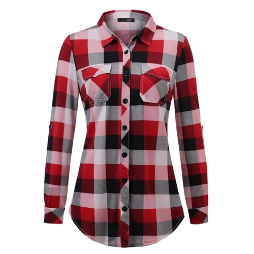 Chemise à carreaux rouges pour femme - Chemise traditionnelle de bûcheron - Haut décontracté - Col en V - Chemisier traditionnel pour femme - Chemisier à carreaux - Chemise à manches longues - Chemise