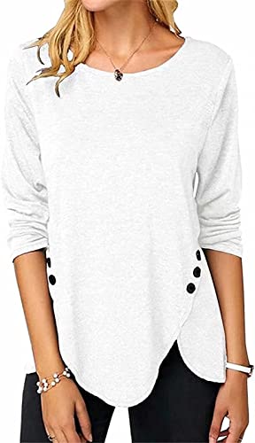 ASKSA Femme T-Shirt à Manches Longues Chemise à Col Rond Tops Lâche Long Tshirts Blouse Tunique avec Boutons (Blanc,XXL)