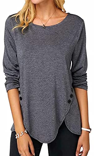 ASKSA Femme T-Shirt à Manches Longues Chemise à Col Rond Tops Lâche Long Tshirts Blouse Tunique avec Boutons (Gris Foncé,XL)