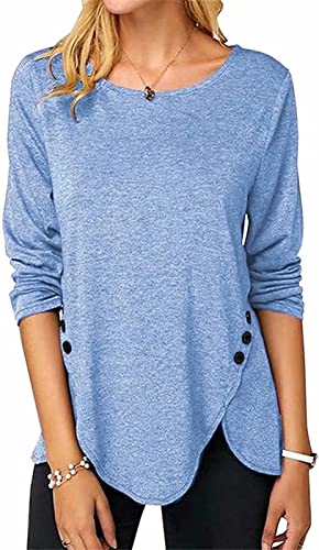 ASKSA Femme T-Shirt à Manches Longues Chemise à Col Rond Tops Lâche Long Tshirts Blouse Tunique avec Boutons (Bleu Ciel,L)