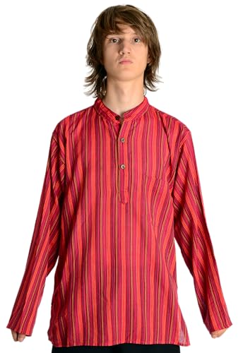 HEMAD - Chemise avec Col Mao en Pur Coton - Kurta De Nepal - Rayée Rouge L