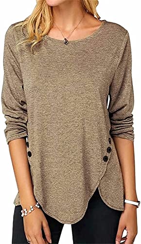 ASKSA Femme T-Shirt à Manches Longues Chemise à Col Rond Tops Lâche Long Tshirts Blouse Tunique avec Boutons (Abricot,S)