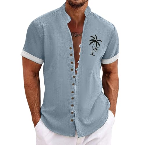 Chemise Lin Homme Vintage, T-Shirts à Manches Courtes Homme Col Mao,Blouse De Travail Homme Imprimé BoutonnéE Solide Haut D'éTé Grande Taille Hawaienne Top RéTro DéContractée Ample Tunique pour Plage