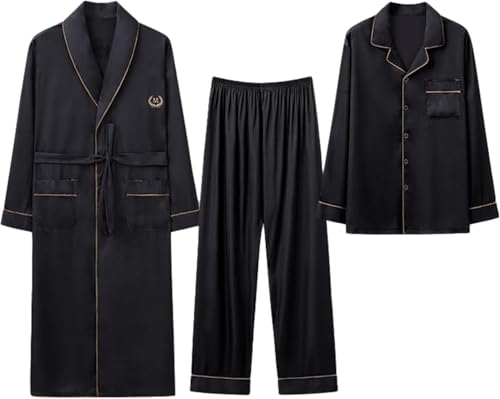 Hommes 3-pcs Ensemble Pyjama en Satin Col Châle Chemise De Nuit Ensemble Pyjama À Manches Longues avec Robe Longue, 1007, XL