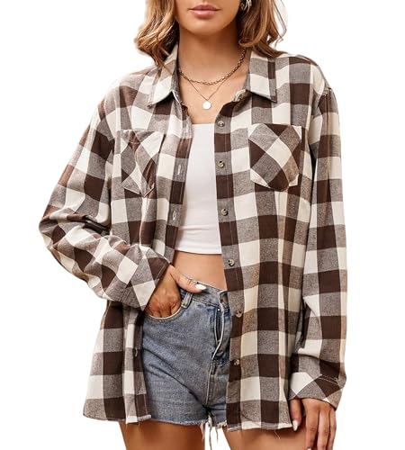 Zeagoo Veste chemise pour femme - Veste à carreaux - Manches longues - Manteau en flanelle - Blouse avec boutons, Marron/blanc., L