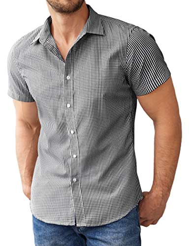 COOFANDY Chemise d'été à manches courtes pour homme - Chemise d'affaires - Chemise à manches courtes - Chemise de loisirs extensible - Tailles XS à 4XL, Noir à carreaux, S