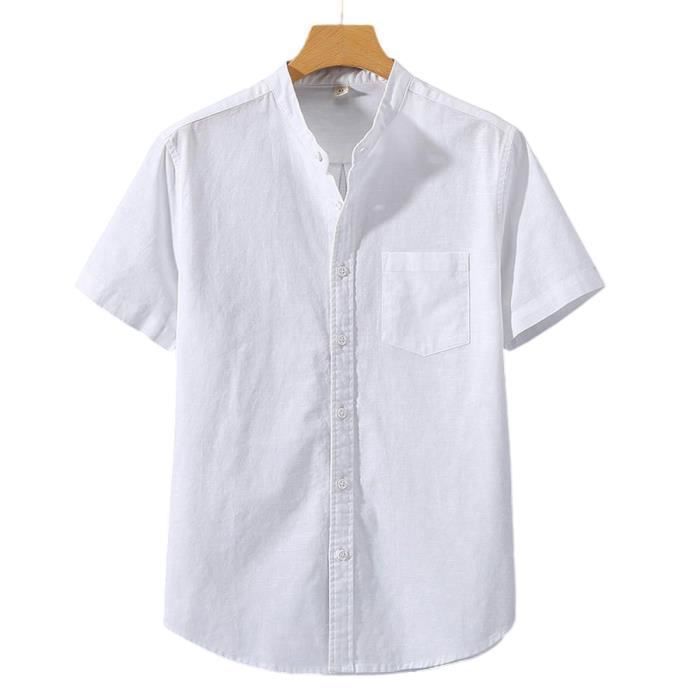 Chemisette Lin Homme Chemise Manches Courtes Blanche Ete en Polo Manche Courte Grande Taille Boutonnée T Shirts Teeshirt Col Mao Legere Haut Couleur Unie De Plage
