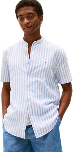 Tommy Hilfiger Chemise Homme Linen Blend Mao avec Col Officier, Multicolore (Breezy Blue/White), S