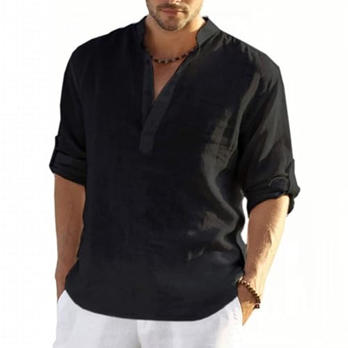MSIYOW Chemise Lin Homme Vetement Col Mao Shirt d'été Casual Manche Longue Chemises en Lin de Plage (XL, Noir)