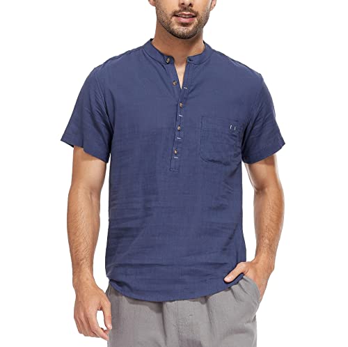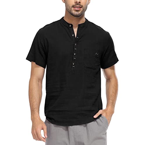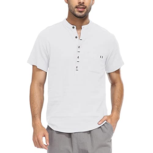 WAZZAP Chemise Homme Manches Courtes Lin Coton Col Mao Casual Hippie Henley Shirt avec Poche