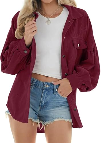 Chemise en Velours Côtelé pour Femme avec Patte De Boutonnage, Veste Surdimensionnée à Manches Longues, Chemisier, Red, M