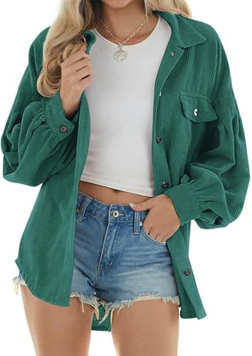 Chemise en Velours Côtelé pour Femme avec Patte De Boutonnage, Veste Surdimensionnée à Manches Longues, Chemisier, Green, S